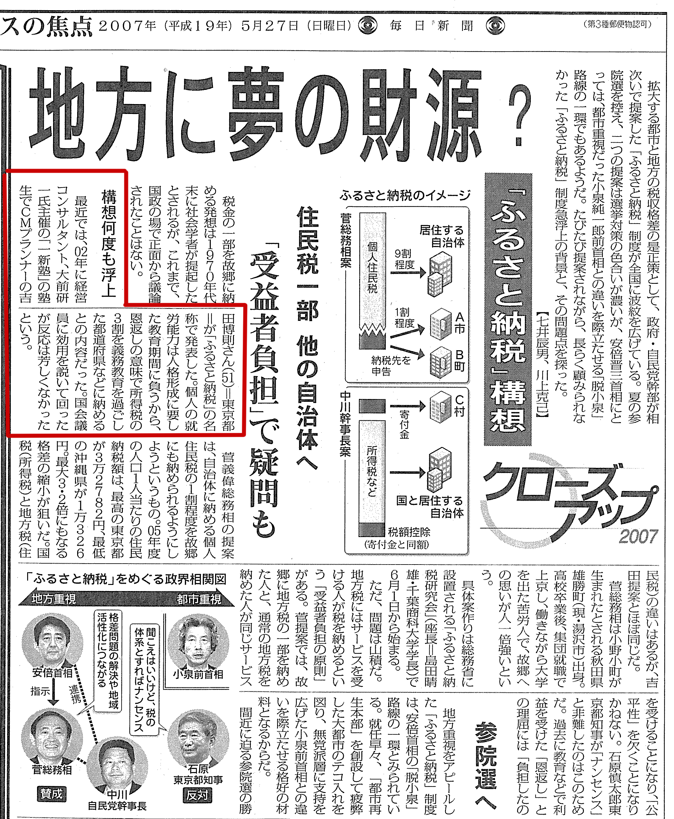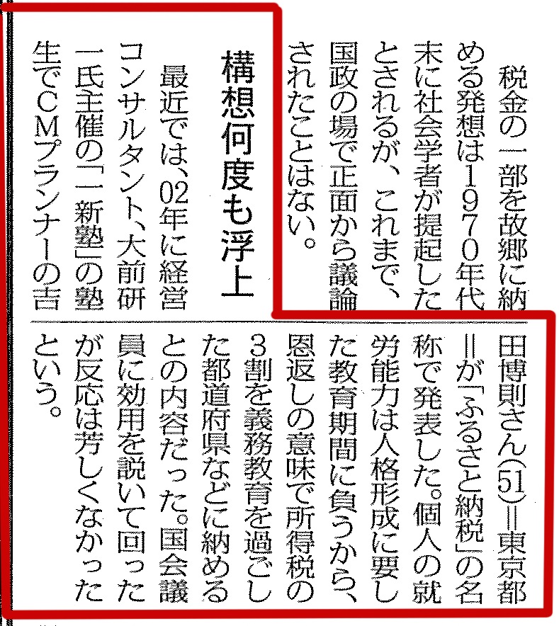 毎日新聞朝刊,クローズアップ2007 特集記事「ふるさと納税」構想(2007年5月27日) 2002年に経営コンサルタント大前研一氏主催「一新塾」の塾生で、CMプランナーの吉田博則 (51) =東京都=が、「ふるさと納税」の名称で発表した。個人の就労能力は人格形成に要した教育期間に負うから3割を、義務教育を過ごした都道府県などに納めるという内容だった。